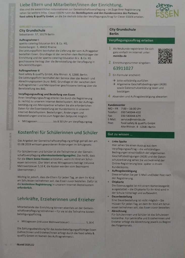 Online-Registrierung für die Essenversorgung in unserer Schule